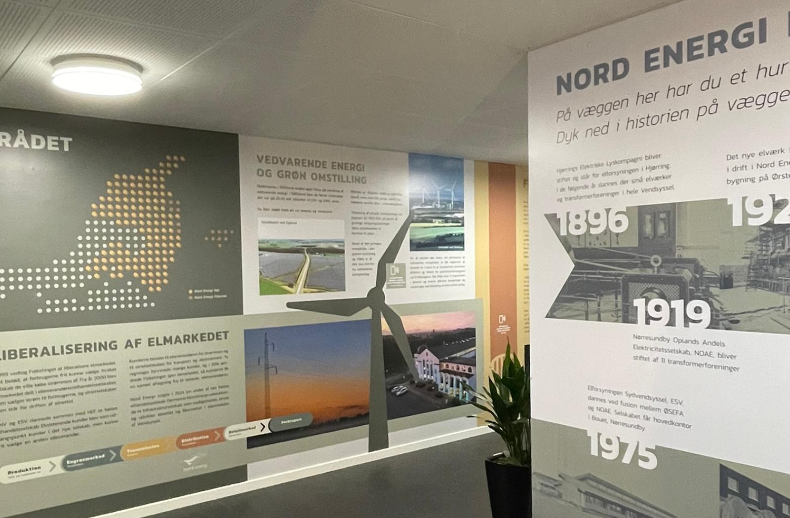 Nord Energi er et stolt, historisk andelsselskab med en lang fortælling om visionære grundlæggere, vinterstorme og digital udvikling. I 2025 gennemgik det gamle hovedkontor en omfattende renovering, og i den forbindelse opstod ønsket om at opdatere den historiske tidslinje og gøre selskabets historie mere synlig og levende i bygningen. Dengang var tidslinjen placeret på en væg i et gangareal.
